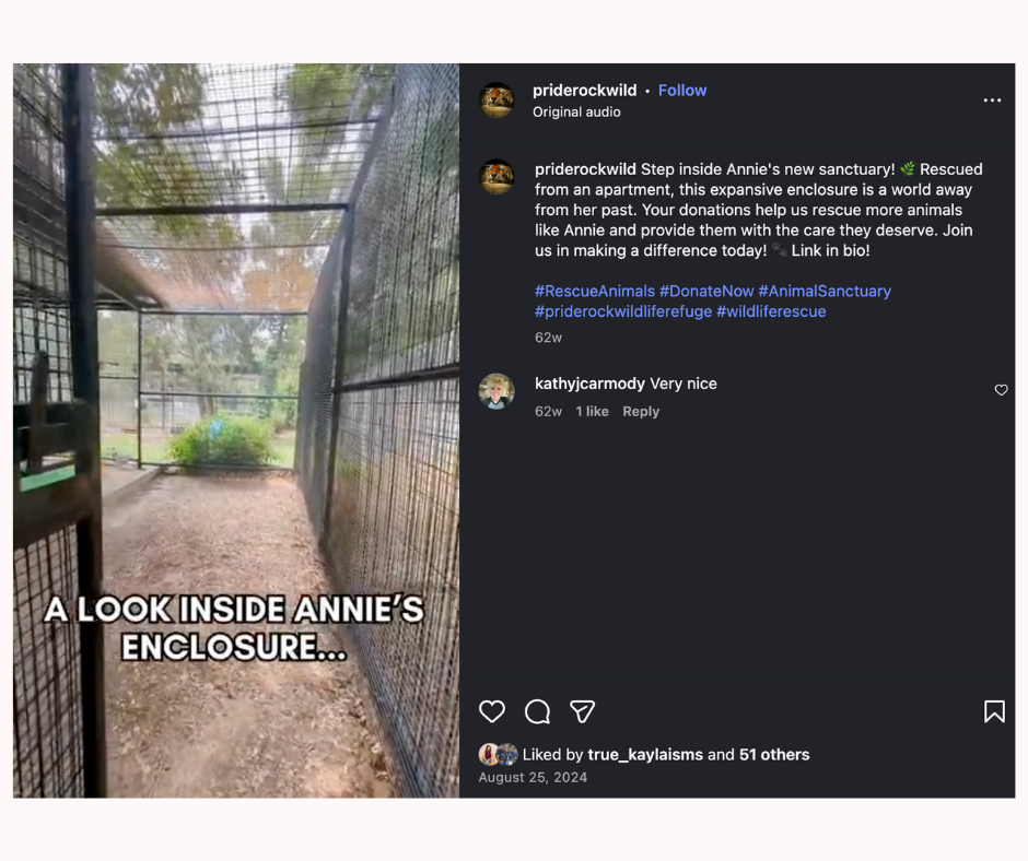 For five years, I led PrideRock’s full social media and digital fundraising presence—transforming their online identity and significantly increasing donor engagement. In this role, I created all social content, launched their first Reels strategy, photographed the animals, designed graphics, and developed messaging that consistently moved supporters emotionally toward action.